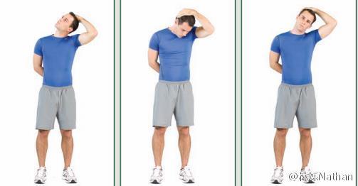 动作流程:1.抬头挺胸立腰正坐,转头至身体左侧45度,收下巴至锁骨中段,右手后背于体后,左手缓慢触压头顶一侧至最大拉伸耐受程度。保持15s后换至另一侧,重复2-3次。