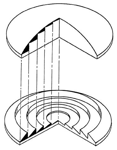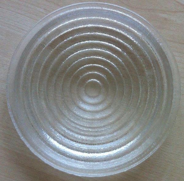 上图中上半部是凸透镜,下半部是等价的菲涅尔镜。实物如下: