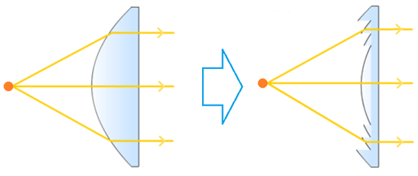 但是凸透镜对于一些闪光灯来说仍然较厚,比如追求超薄的手机,因此人们就用更薄的菲涅尔镜来代替凸透镜。菲涅尔镜的构造如下: