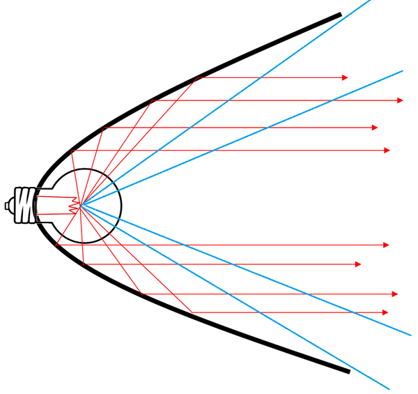 http://pic2.zhimg.com/a91e84e51f665dc32a218210b3da6ee1_b.jpg上图可以看到,光源射向后方的光线(蓝色)被凹面反光镜聚集以后水平射向前方,但是射向前方和侧方的光线(黄色)只有一小部分,也就是真正笔直向前的可以照到被摄物体,其它方向的也全都散失了。为了解决这个问题,最简单的方法就是加深反光镜: