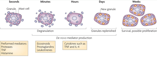 Fig2. Mast cell参与免疫的方式。主要是通过degranulation(颗粒释放)和replenish(颗粒再生)循环进行的。Mast cells一般情况下也拥有着相对久的寿命。