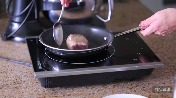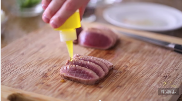 3. 吞拿鱼排取出,回温后用盐、胡椒、橄榄油调味并充分按摩