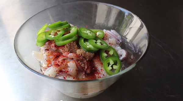 用植物油、辣椒粉(这个配方用到了哈雷辣椒、烟熏辣椒粉、普通辣椒粉三种,可以用朝天椒粉+烟熏红椒粉代替)、棕糖、新鲜辣椒(这里是哈雷辣椒,可以用尖椒)、盐拌匀调味