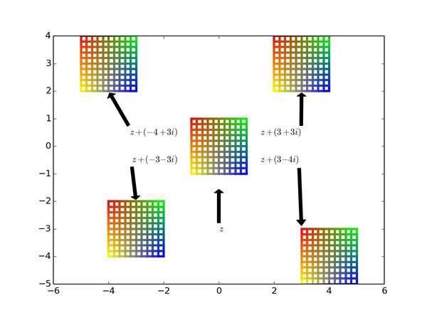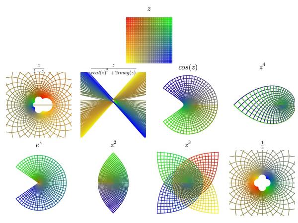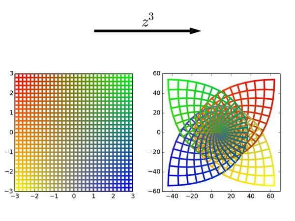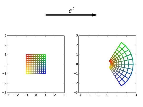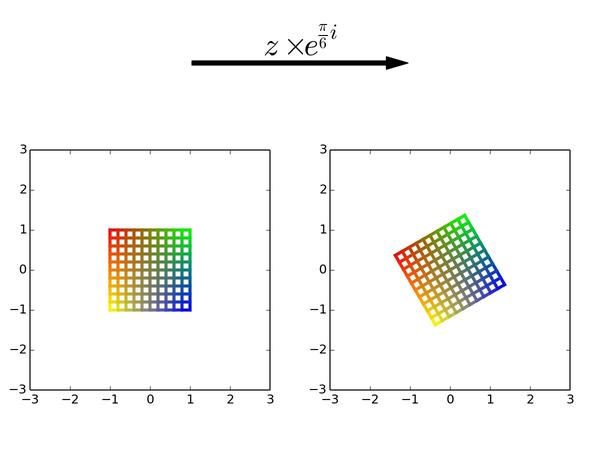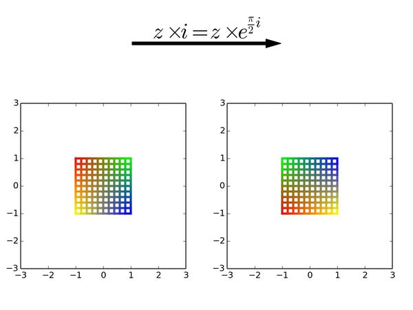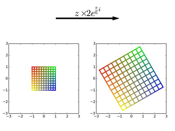 以后看到复变(准确地说是解析)函数,可要记得它们的本质是对平面局部做旋转和缩放,但保持小正方形形状不变。而一个复数就是一个能把平面进行均匀缩放和旋转的乘子。最后,请记得我的彩色正方形!