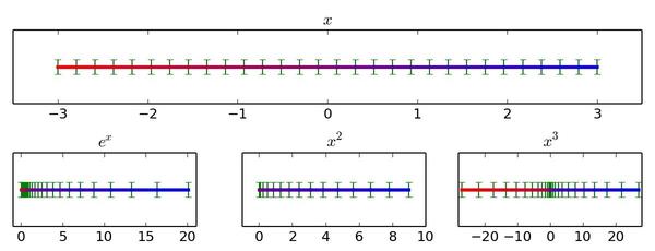 http://pic1.zhimg.com/9666de25a0cfd29d72c4e3d1b86079d0_b.jpg 它们的特点都大同小异:把实数轴对应到实数轴。然而,既然是一维函数,用二维图像来描述未免太过奢侈。如果我们把数轴涂上不同颜色,再把一条新数轴上对应的函数值涂上相应颜色,就可以清晰地用数轴-数轴对应来展示函数这一关系: