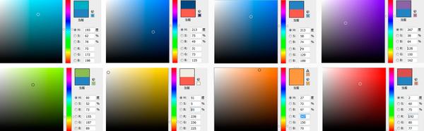 第一行颜色(黑白除外)的色值如下图所示。H代表色相,S代表饱和度(/纯度),B代表明度;方形中的横轴表示饱和度,纵轴表示明度。http://pic3.zhimg.com/e981745e58c642a0e2fb5505617f8d56_b.jpg