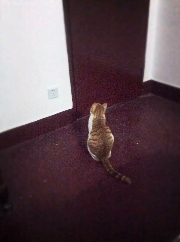 萌萌也离不开他,有一次他出去倒垃圾,我拍到了这张照片