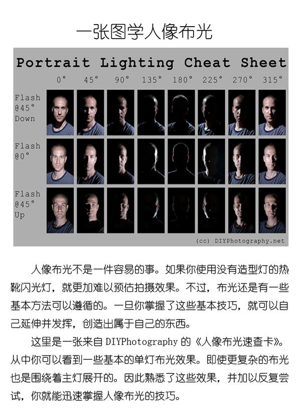 室内光源的话,不能不提这张经典的单灯布光图。因为是基础单灯布光法,所以在家也很容易做得到,台灯手电都可以。