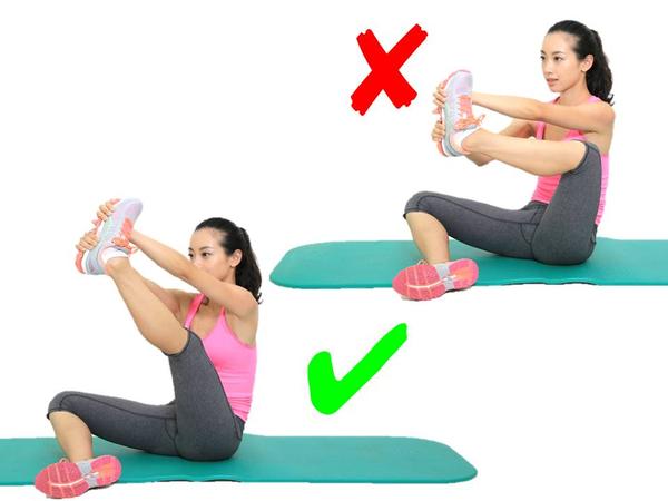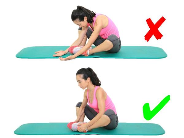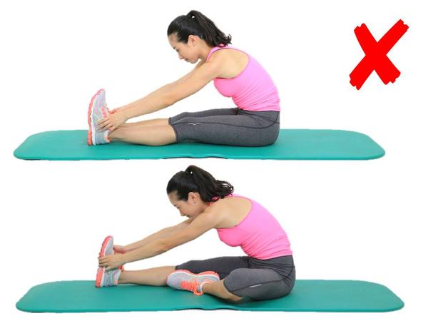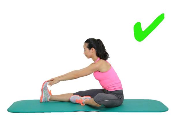 有些跑友牵拉大腿内侧往往是盘腿、脚心相抵,然后就手往前一伸,开始拼命往前蹭……这样其实不对,牵拉不到目标肌肉,还容易造成腰椎的较大压力;正确动作是盘腿、脚心相抵后,在保持腰背挺直的情况下,用手肘将腿往下压就行了。