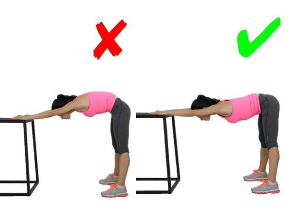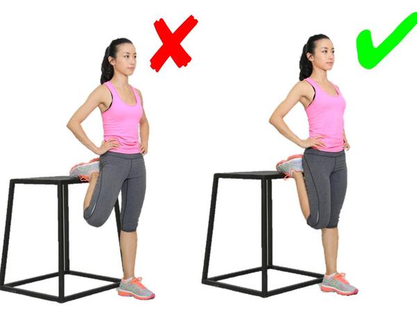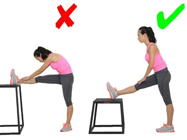 其实大腿后群的牵拉并不一定要用手去碰触脚尖,这样的动作对于柔韧性不好的人有很大隐患:容易弯腰驼背造成脊柱的过大压力,同时容易牵拉强度过大。这一动作应该找个适当高度的物体,有牵拉感但不觉疼痛就行,还要保持腰背挺直。