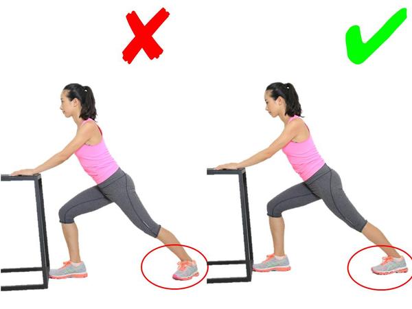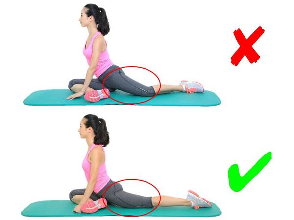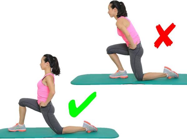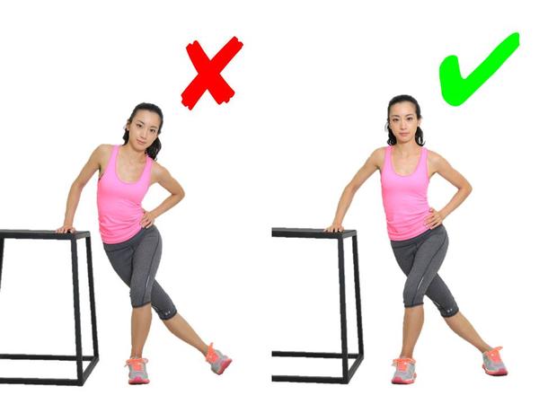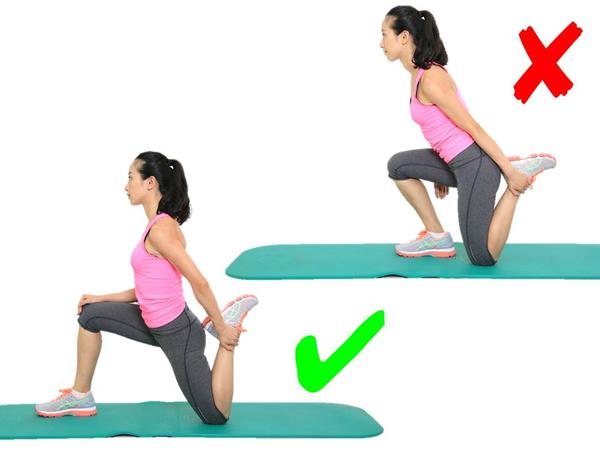 看着跟跪姿的大腿前群牵拉很像,其实不同!弓箭步一定要大,同时要注意腰背挺直,身体不要前倾,这样的错误既没有办法充分的牵拉到髂腰肌,对脊柱跟腰椎也不好;同时注意前腿膝盖尽量不要超过自己的脚尖,防止膝关节压力过大。