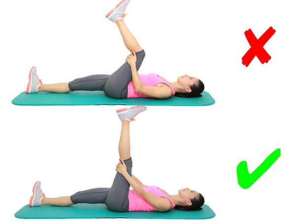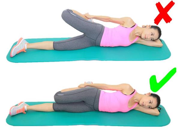 这个动作看着挺简单的,就是翘个二郎腿往身上拉,但是有些小细节要注意!不要把腰部拉离垫面,头部平躺于垫上。错误动作导致的问题就是:腰椎跟颈椎的压力会比较大。