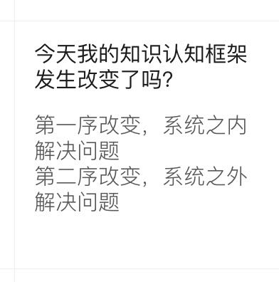 第二序改变:改变发生在系统之外,控制系统整体的前提改变,使系统转换到完全不同的状态,也即改变之改变,简直就像量子跃迁。例如,从梦中醒来。
