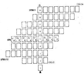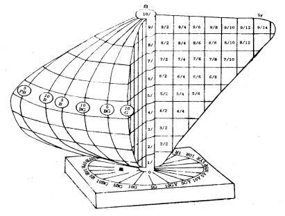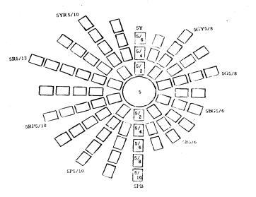 《孟塞尔颜色图册》是以颜色立体的垂直剖面为一页依次列入。整个立体划分成40个垂直剖面,图册共40页,在一页里面包括同一色相的不同明度值、不同彩度的样品。如图5-19所示,是颜色立体5Y和5PB两种色相的垂直剖面。中央轴表示明度值等级1-9,右侧的色相是黄(5Y)。当明度值为9时,黄色的彩度最大,该色的标号为5Y9/14,其它明度值的黄色都达不到这一彩度。中央轴左侧的色相是紫蓝(5PB),当明度值为3时,紫蓝色的彩度最大。该色的标号:5PB3/12。