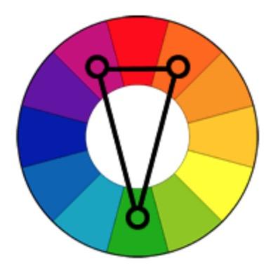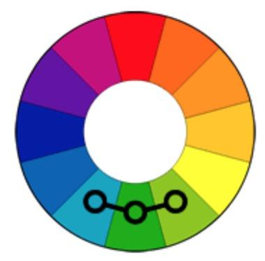 和互补色很相似,其对立色是补色的邻近两色。如图绿色的补色是红色,那它的分散互补色就是紫红色和橙红色。也和互补色一样,其视觉差很大,也是容易吸引人眼球,但是没有补色的强度高。但用分散互补色比补色保险,所以也不偿为一个保险又出彩的选择。