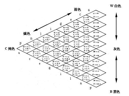 消色系统的明度分为8个梯级,附以a、c、e、g、i、l、n、p的记号。a表示最明亮的色标白,p表示最暗的色标黑,其间有6个阶段的灰色。这些消色色调所包含的白和黑的量是根据光的等比级数增减的,明度是以眼睛可以感到的等差级数增减决定的。