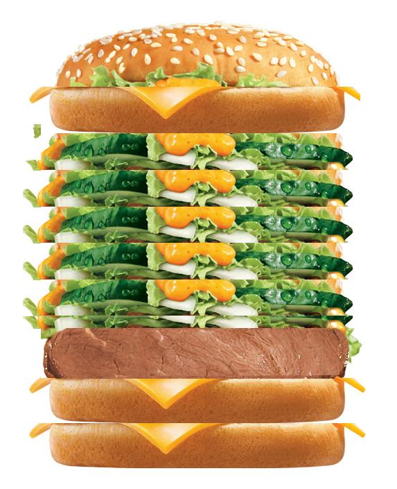 为了简便理解,直接用汉堡侧面看到的比例代替汉堡真实食材比例