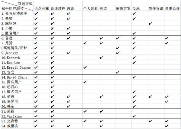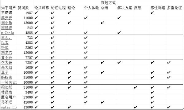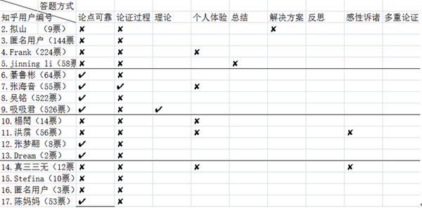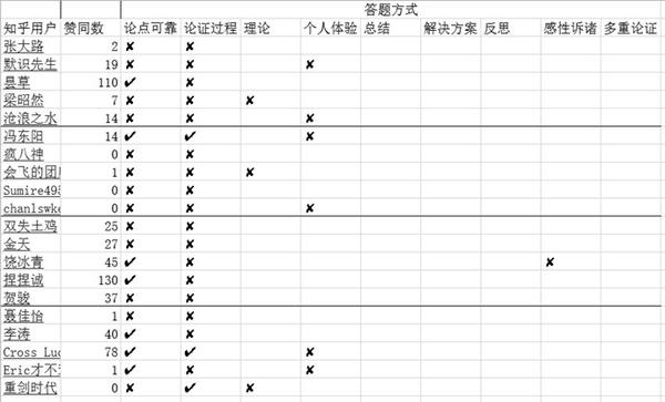 我将总结的8种特征简略地横向标出,将每题选中的高赞知乎用户纵向标出,将答案内容达到的特征划上“✔”,未达到的特征划上“✘”,若未涉及该种特征,则为“ ”(空白)。以特征体验为例,高赞答案的体验往往具有独特性、高切题性和高说服力,而低赞答案的体验往往是无特色、低切题性、低说服力。即使同样是运用了体验的回答方式,但是与高赞答案的体验的内容水平是不一样,将无特色、低切题性、低说服力归为体验(✘),其他同理。