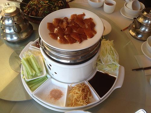 羲和雅苑给人的印象就是真的很专业,鸭肉和面饼下都有热水保温,让你全程都能吃到鸭子的最佳口感.有趣的是,它家的调料里还有跳跳糖,用它来沾鸭皮吃十分有趣.