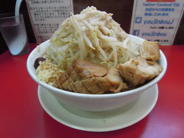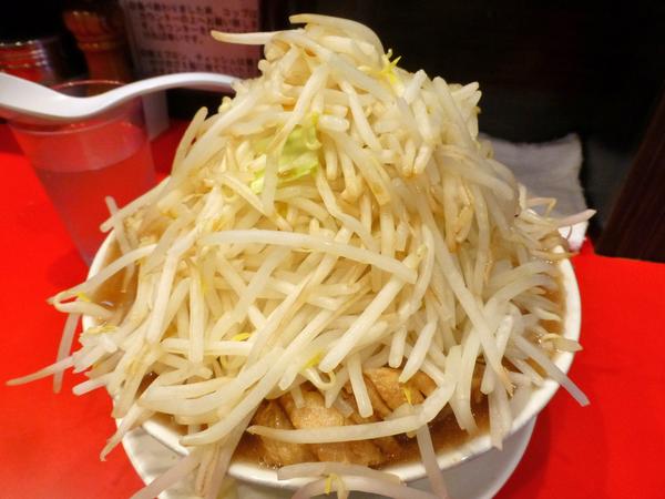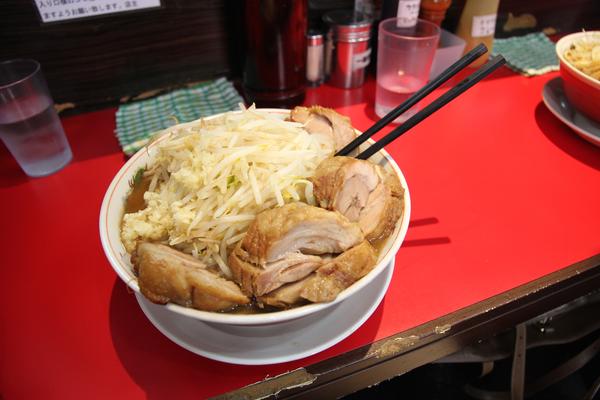 为何二郎会被称为上级者拉面店呢,其实只要看到端上来的碗就全明白了。当你面前摆着一碗由拉面、大块叉烧、豆芽和卷心菜堆积而成的小山的时候,我想所有人内心的第一反应都是崩溃的。二郎不单分量极其恐怖,价格也要比普通拉面店低廉,500日元一碗,600日元一大碗(大盛),没有做过功课的同学绝对不会想到端上来的是这样的一盆东西。