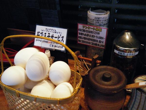 极家独有的特色在于,这里午饭时鸡蛋是随便吃的(卵食べ放題)。对,你没有看错,点过拉面之后小二便会拿取一小篮糖心蛋摆在你面前,示意请尽情享用。