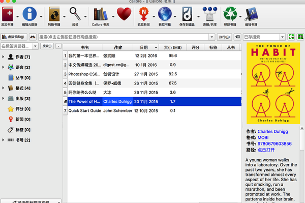 Calibre 是一款电子图书管理软件,其提供的“一站式”的电子书解决方案,可以基本满足读者对电子书需求,甚至可以利用它组织成属于自己的电子图书馆,它的功能更是多种多样,不仅可以用它对图书进行格式转换,归类整理电子书,还可以将文本图像材料、在线内容(RSS)加入并转换为电子书。更重要的是Calibre是免费的、开源的,拥有跨平台的设计,可在Linux, OS X和Windows操作系统中运行。