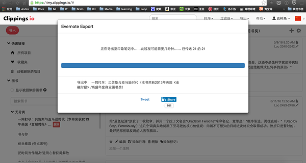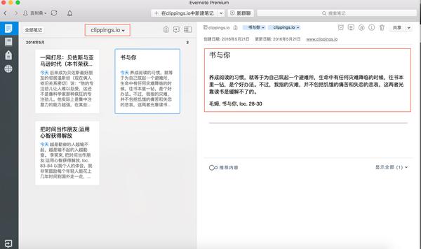 Mate抑或是http://Clippings.io就可以做到(具体见下部分的神器介绍)。前者可以按照作者进行txt导出,然后传到有道云笔记或者印象笔记中进行笔记整理;后者可以直接在网页上绑定到印象笔记中进行标注内容传输操作,如下图所示☟