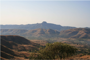 这个火山位于今天的印度。图中的棕色区域就是当年的火山范围,它的面积相当于整个法国。今天,这个地区留下了一个巨大的火成岩地貌。我们把这里叫做德干地盾。