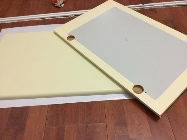 翻新的方法就是淘宝买翻新贴纸,原木色的,按柜门尺寸大一圈裁剪好大小。柜门拆下来,包括门把手,贴好再装上去。