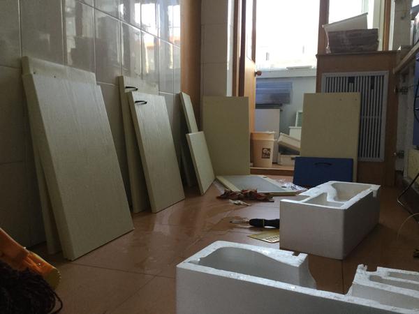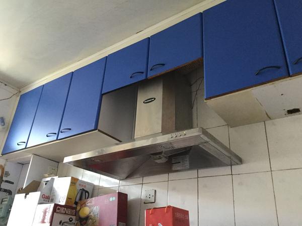 然后是厨房,原来的厨房跟卫生间一样也是蓝色地中海风格,有点闷。于是在买了家具翻新贴纸,改了整体颜色。其实这种贴纸背面有胶肯定不环保,考虑到厨房可以24h通风,而且呆的时间少,忍了。