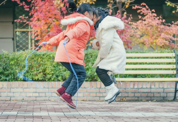校园里跳绳的两个小女孩,一不小心两张脸吧唧撞到了一起。停下来捂着鼻子愣了两秒,大笑着打闹着越跑越远。
