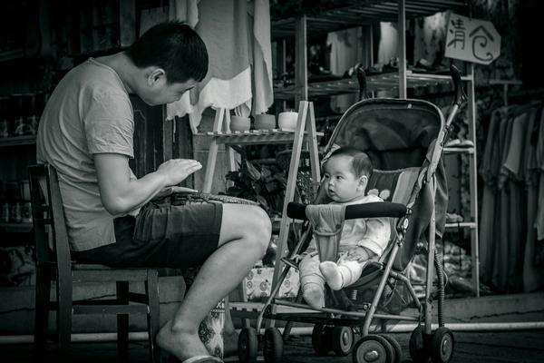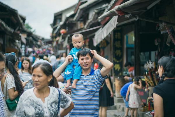古镇里背着孩子的父亲,看着镜头忍不住笑了。