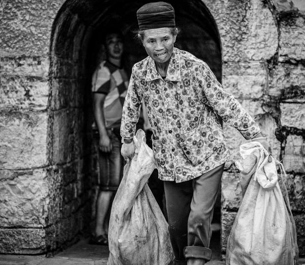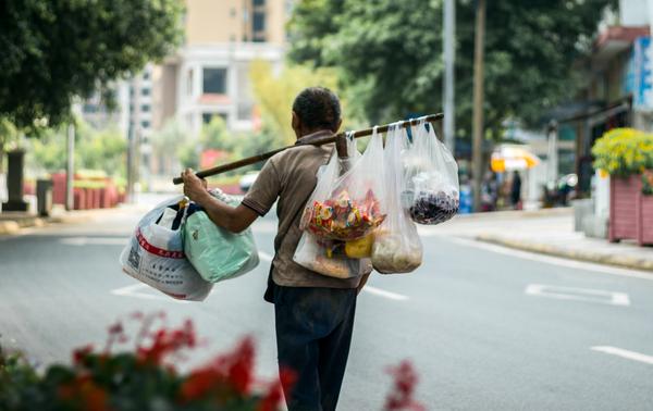 老人扛着一袋袋衣服和水果零食远去的背影。