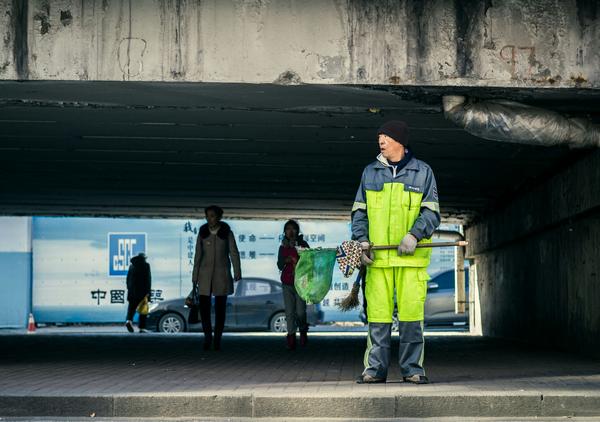 公路边等着过马路的清洁工,眼神里的迷茫,就好像是走丢了。