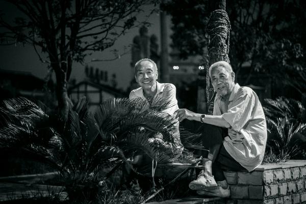 在路灯下聊天的老人,很和蔼地看着镜我拍照。
