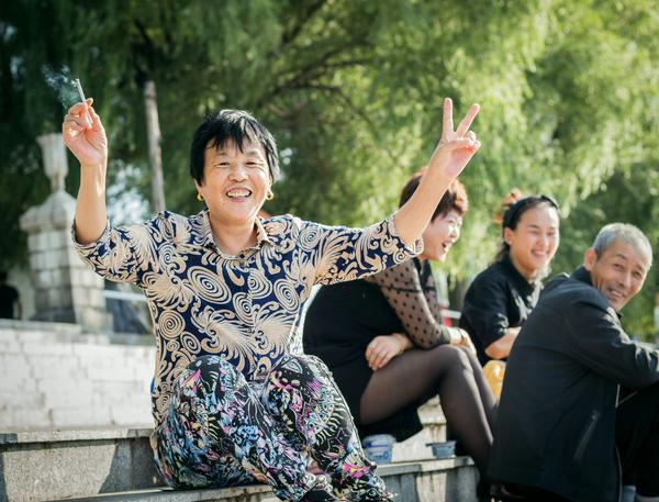 松花江边吸烟的老奶奶,在身边老伙伴们的提醒下发现自己被镜头选中,很开心地冲着我比了一个大大的二。