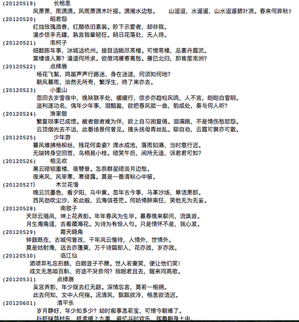 12年的时候,喜欢微博上的一个女孩,一位古风爱好者,喜欢宋词,为了套近乎,我就开始拼命的学习宋词,开始了我的每日一词计划(括号里的数字是日期)