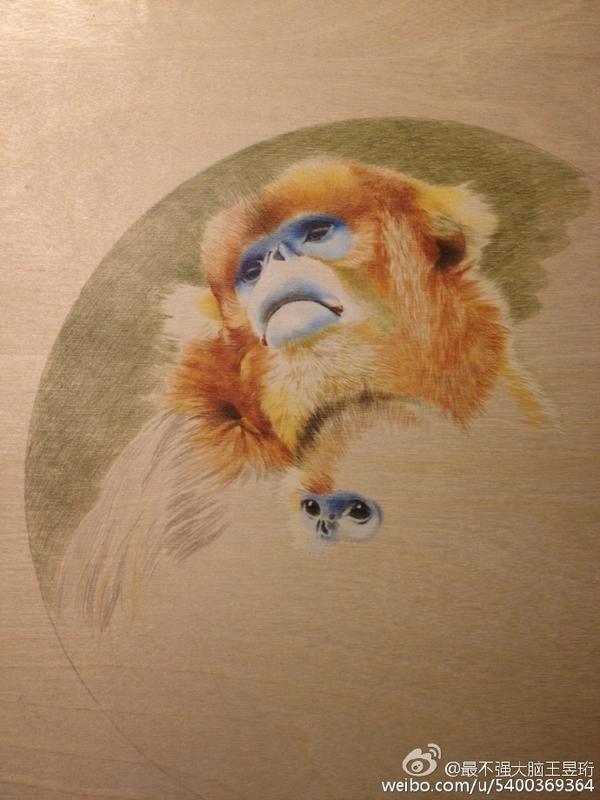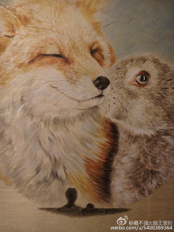 粗糙的木板与粗糙的彩铅画笔,两种粗糙的材质居然能把两个物体毛茸茸的触感表达得如此精细逼真。