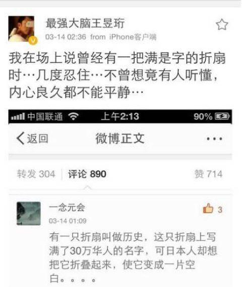 2015年3月13日,在《最强大脑第二季》中日PK赛第二轮扇面识别比赛时,赛场地点在南京,而中国队当时以0:1落后日本队,主持人问王昱珩赛前的心情,王昱珩脱口而出:“等到背后飘着中国国旗的时候我再说”。