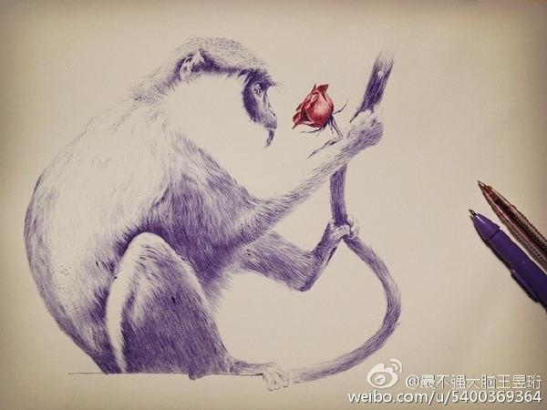 还有相对更粗糙的画具,用随便哪个角落里翻出来的一篮一红两支圆珠笔就娴熟地画了一幅作品,这次连铅笔稿都没打。