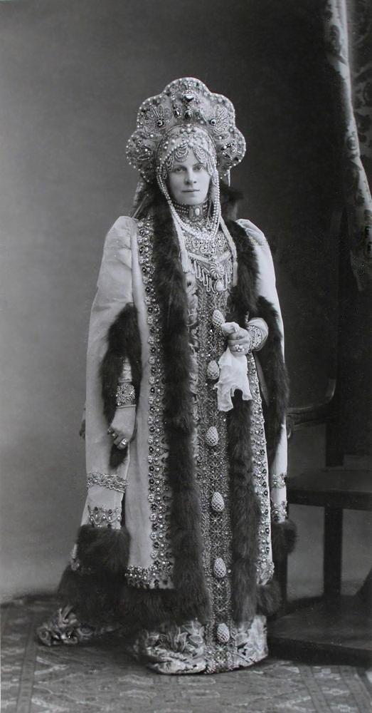 这位皇家贵妇的留影摄于1903年,地点也是冬宫。看来室内的温度其实也就那么回事。全身长袍,这件长袍上的假袖子是民族服装中俄国女性最喜欢的设计,冷的时候手臂在里面,需要展示一下身条的时候可以光手臂或薄衣服穿这种袍子,到时候把手臂伸出来就是。