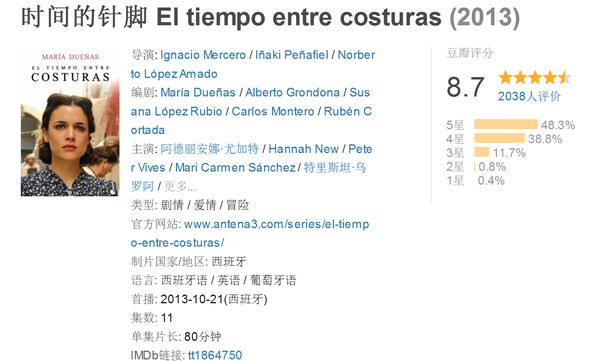 如很多爆款剧一样,《时间的针脚》也是从一部小说开始的。这本当年被誉为“西班牙第一畅销书”的作品在西班牙一共卖出了150万本。