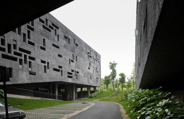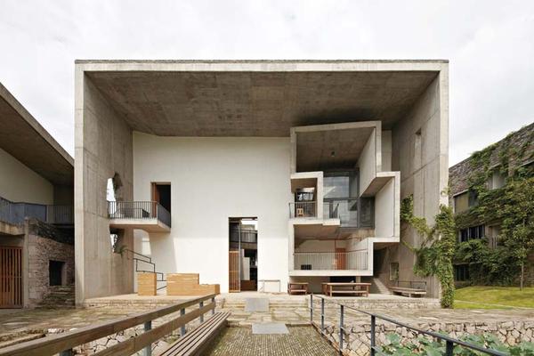 整个校园充满艺术气息,建筑错落有致,以中国传统“大合院”的形式呈现,建筑与周围的植被、水景也十分融洽。建筑中的宽大走廊,如路亭般的山边、水边小屋,都是某种既可步行,又可展览的地儿。