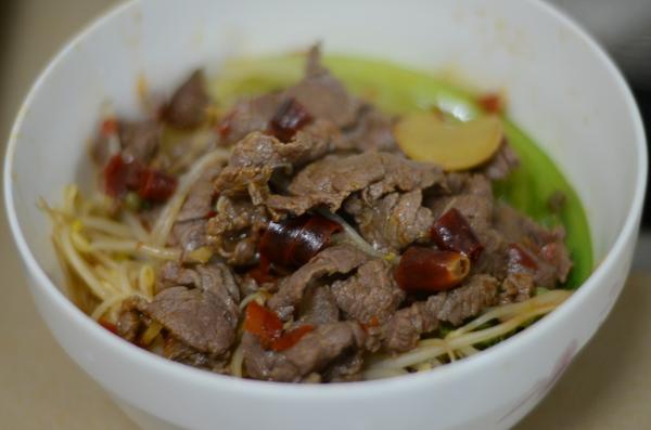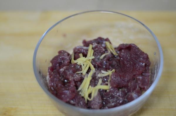如下图。https://pic2.zhimg.com/v2-5bbba66563a05a37fbc08f05500e8655_b.jpg2、切好的牛肉,放料酒,鸡精,盐,油,姜丝腌制一小会。