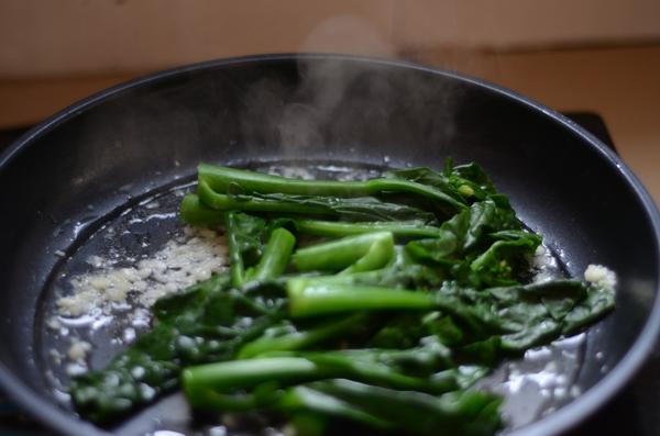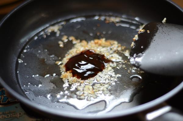 3、热锅下油,将蒜蓉炒香后下蚝油一起炒香,