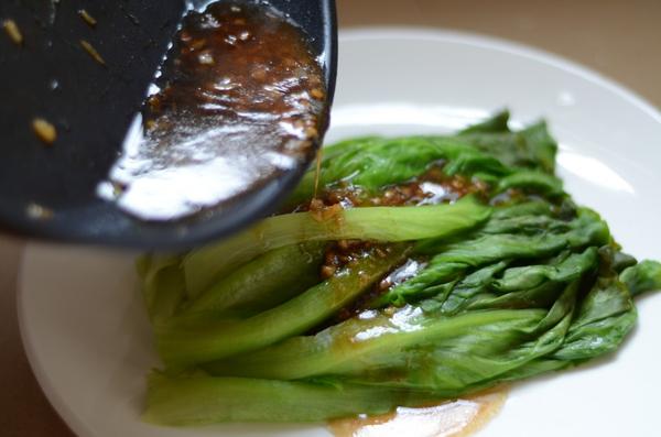 2、锅里放水烧开,将生菜烫熟,捞起摆盘。