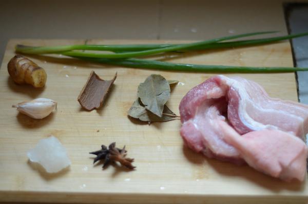 五花肉(6块钱,自己够吃了)、姜一小块、蒜头2个,葱,桂皮,香叶,八角,冰糖,老抽盐油料酒适量