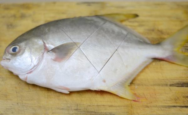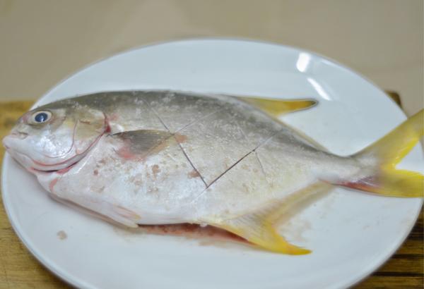 1、金鲳鱼洗干净,用刀在鱼身上划几刀,随便划,你觉得怎么好看就怎么划,不要划到手指就好。