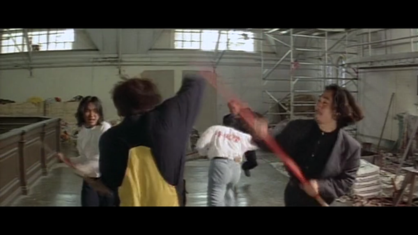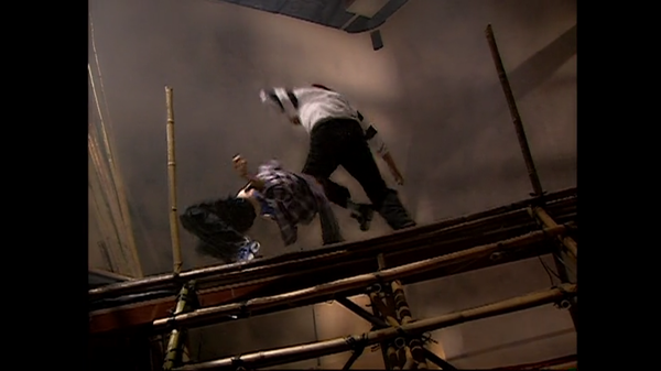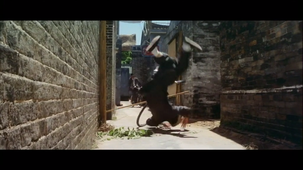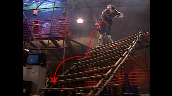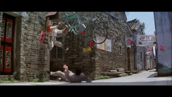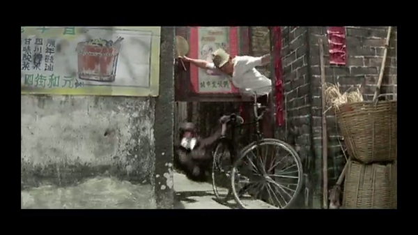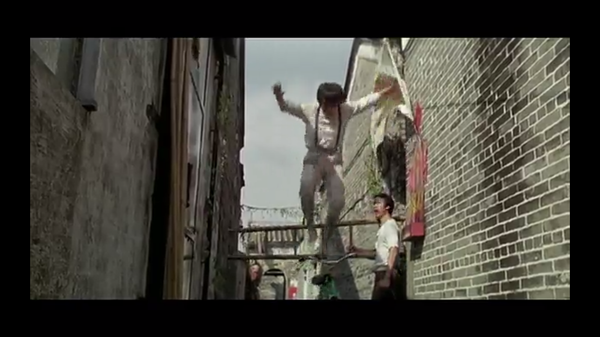 同时成龙非常善于利用场景和道具加入动作戏中。如《A计划》中这个巷道追击就是一个典型。利用小巷子里的门,梯子,晾衣服的竹竿等等。