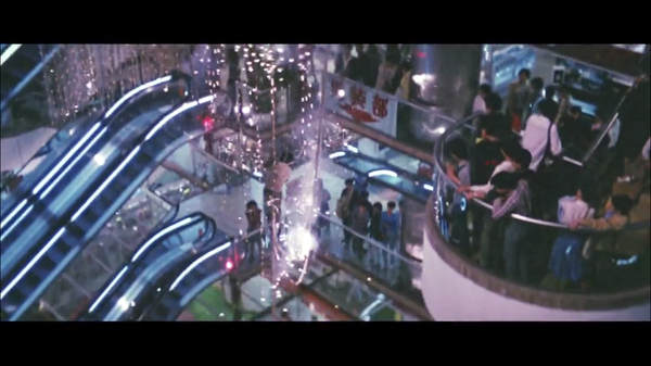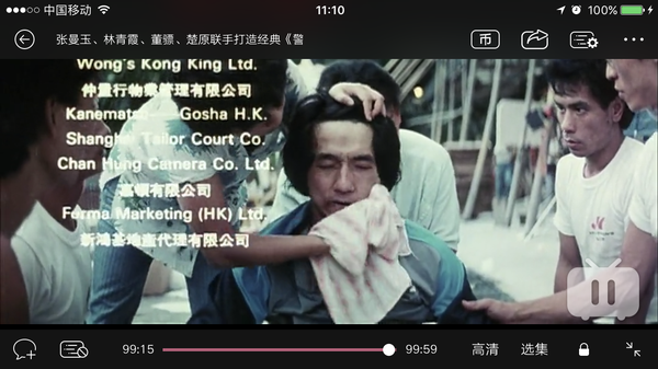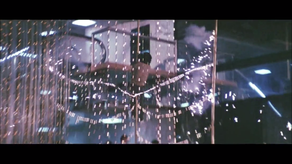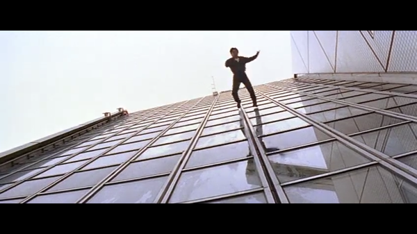 从几十米高的楼层跳,抓住中间的铁杆子往下滑。杆子上缠着电线,直流电灯会暗,效果不好,用交流电,一缠住就完蛋。成龙跳下来后,林青霞和张曼玉抱着他哭。